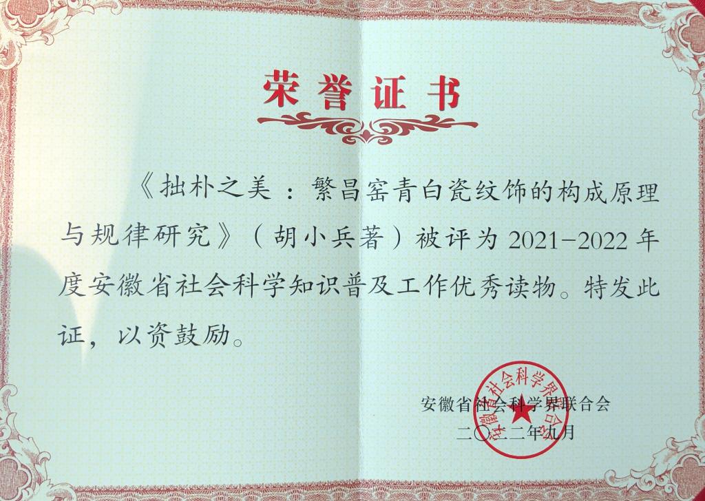 9月15日,安徽省第十八届社会科学知识普及活动月开幕式在黄山市举办,sunbet教授胡小兵新作《拙朴之美:繁昌窑青白瓷纹饰的构成原理与规律研究》(中国陶瓷2022年第三期刊载)被评为“安徽省社会科学知识普及工作优秀读物”。