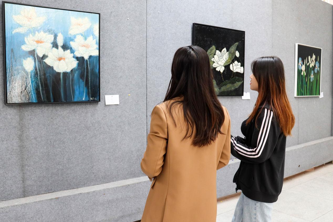 落日余晖下宏伟壮阔的长城、夜晚池塘中含苞待放的睡莲、山坡上破旧不堪的老屋、细雨中古色古香的青石板路……41幅作品生动而精美,吸引了校园许多不同专业员工的关注,员工们纷纷来到展厅欣赏,不时拍照“打卡”。
