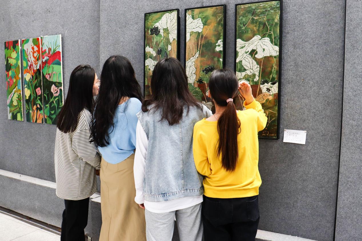 “真是‘术业有专攻’呀!”新闻传播学类专业2021(2)班的余子怡坦言,这是自己第一次参观漆画艺术展,每一幅作品都让自己感到震撼,参观这样的画展对自己来说是一种美的享受和艺术的熏陶。“美院员工们能够通过所学技能将蛋壳、荷叶等随处可见的材料‘变废为宝’运用在画作上,真是太厉害了。”