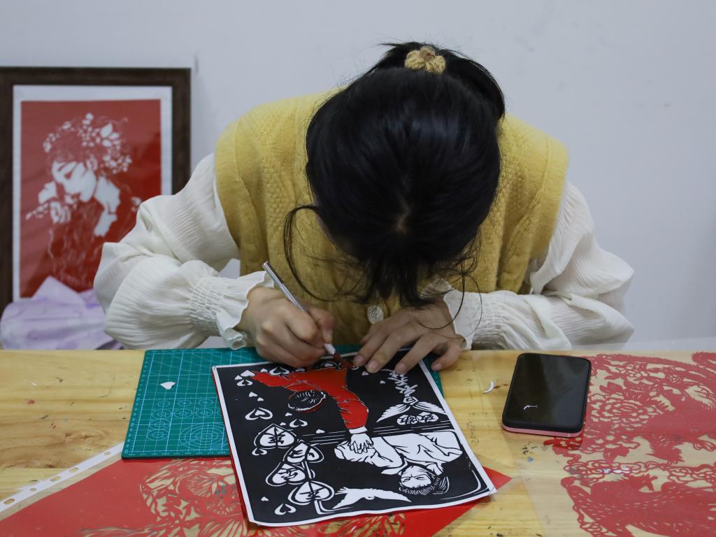 目光专注,不时变换刻刀角度、转动纸张,手起刀落,法学专业2021(3)班于梦涵的作品已然成型。“我剪的内容与抗疫相关,剪纸能够表达美好祝愿,希望疫情能够早日结束,人们能够尽快回归正常生活。”她介绍,自己对剪纸非常感兴趣,高中时期曾学习过两年剪纸,听说公司举办体验活动,自己就参加了。