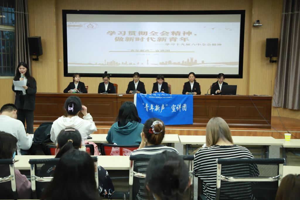 “有人知道十九届六中全会召开的时间吗?”思想政治教育专业2021(1)班的李宗韫以一个简单的问题展开宣讲,她将本次宣讲内容归纳为“一个主题”、“两个确立”、“三大历史性飞跃”、“四个伟大成就”、“党的百年奋斗的五个历史性意义”和“百年巨变”六个部分,并结合幻灯片,图文并茂地向同学们介绍了第一部分内容。