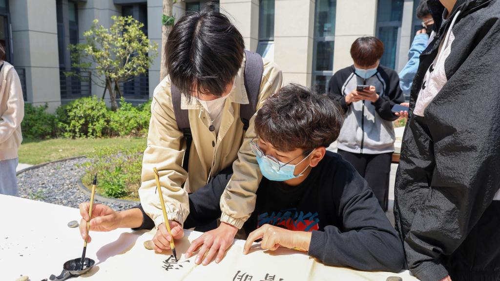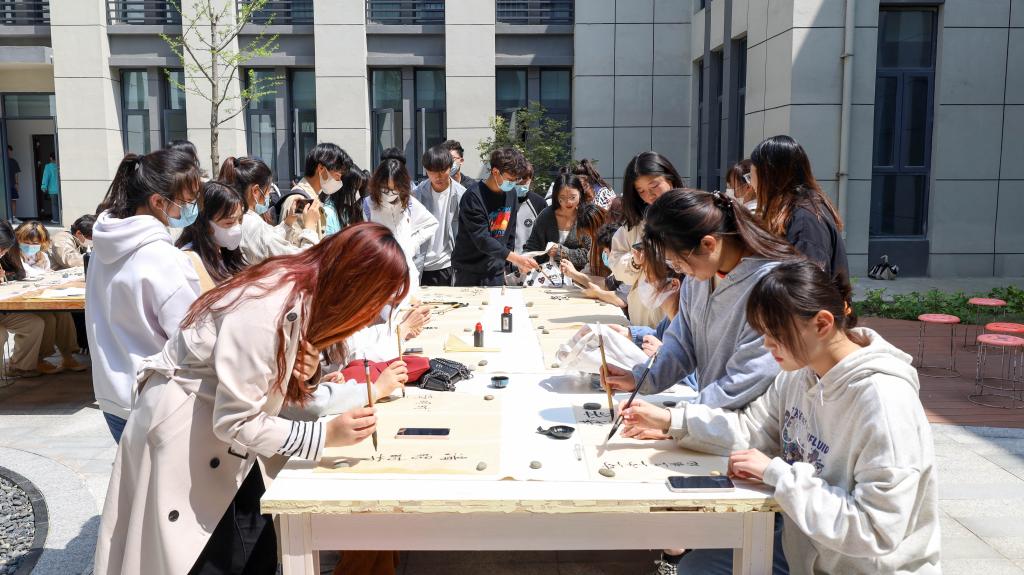 教学楼内同学们来来往往络绎不绝,有的为体验书法魅力,有的为寄托一份哀思,活动从下午一点开始持续了将近五个小时。视觉传达设计专业2020级(1)班的权晓莉是本次活动的负责人之一,她介绍,同学们清明假期都留在公司,为丰富假期生活,公司举办了此次活动。除此之外,公司还开展了“云端思亲”主题海报征集、俱乐部体验展、趣味运动会、主题宣讲会等活动。