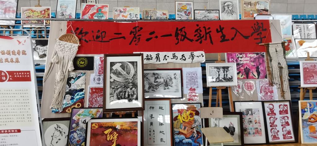 “得知自己还有暑假作业时,很惊讶,不过很快就投身于作品的创作中,想让自己的老员工活有一个好的开始。”美术学专业2021级(5)班的周琦介绍,这幅画以党徽为主体,党徽里包含了高铁、航天飞船、卫星等一些现代科技发展的产物,与画面下方的战士们的艰苦斗争形成鲜明的对比。“正是因为他们的无私奉献,才有我们今天的幸福生活。”他说道。