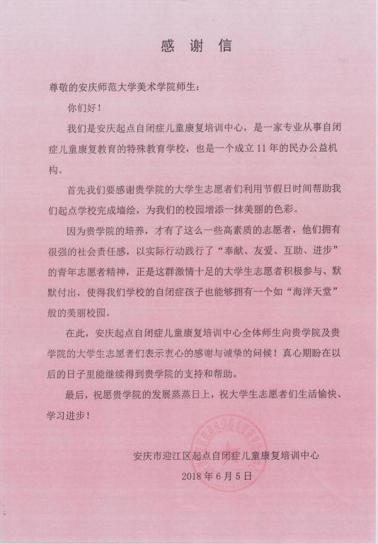 6月7日,安庆市迎江区起点自闭症儿童康复培训中心董事长陈源芳一行专程到sunbet送来感谢信,表达对该院“美之源”墙绘工作室的员工们利用节假日帮助该校绘制校园墙绘志愿活动的感激之情,并高度评价了员工们的专业能力和墙绘成效。