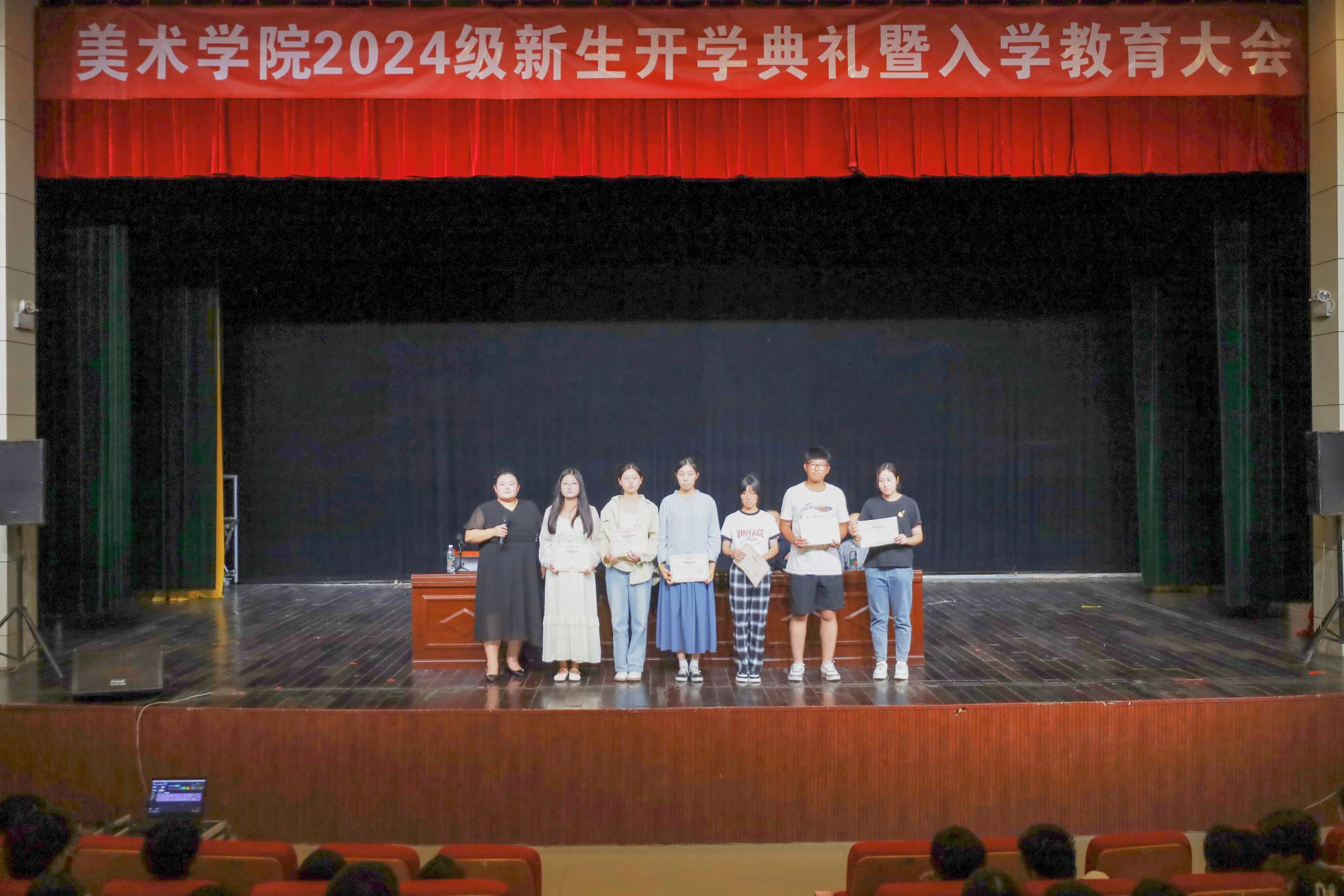 苏志岩宣读了2024级新生入学作品展获奖名单,并为获奖员工颁发证书。她要求全体新生尽早做好生涯规划,积极参与学科竞赛,谱写属于自己的青春华章。