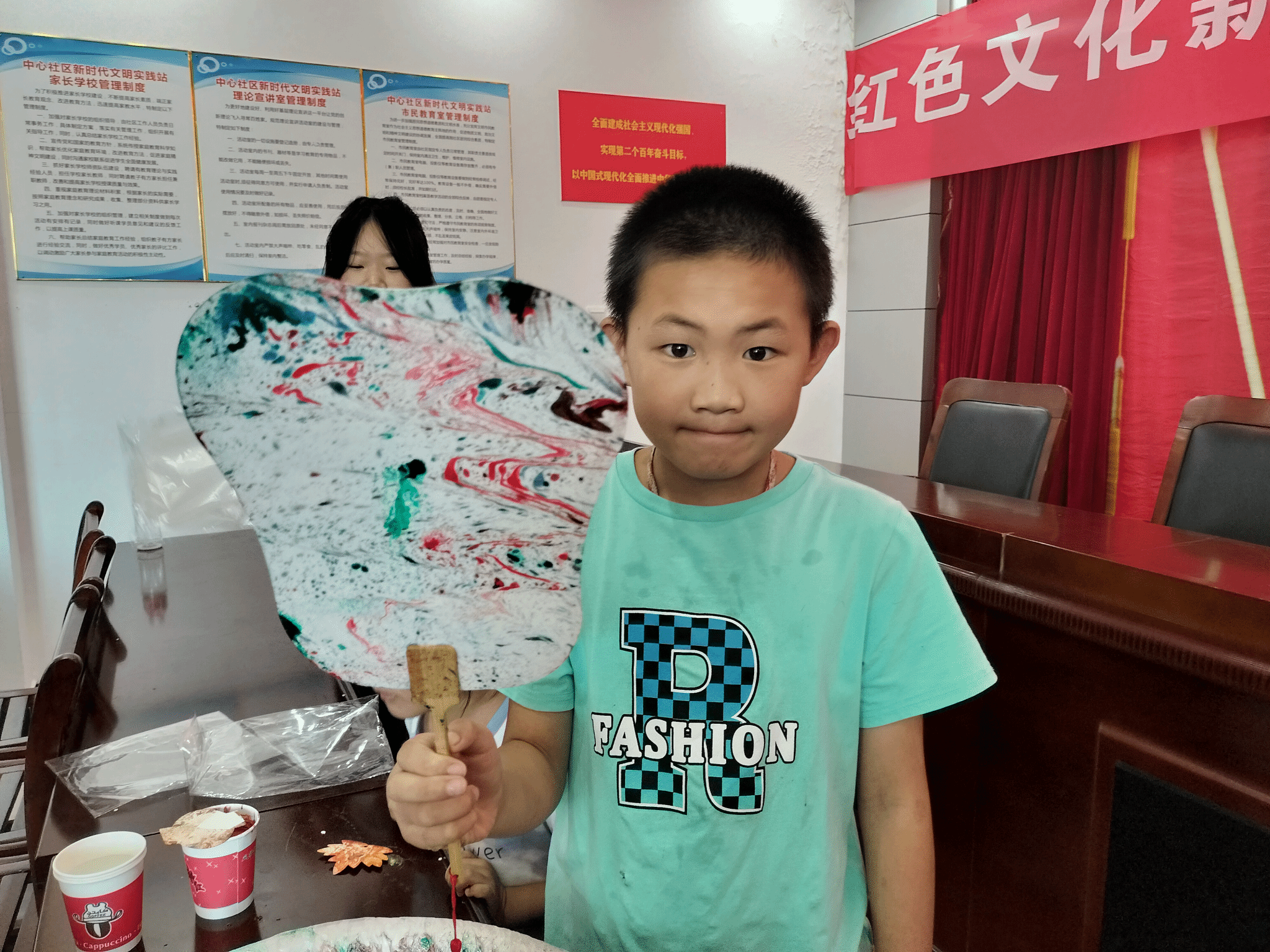 漆扇在年初时由于其蕴含的独特美感在社交媒体上“出圈”走红,在暑期美育实践教学课程中,团队成员将这一非遗文化带到了大龙山镇中心社区,让20多位小朋友与漆染技艺“面对面”。随着素扇与书签浸入混合的大漆中,一份份独一无二的非遗作品出现在小朋友手中。“原来不同的颜色混在一起这么好看,我之前都没有尝试过。”在体验漆染技艺后,小朋友们纷纷感叹。