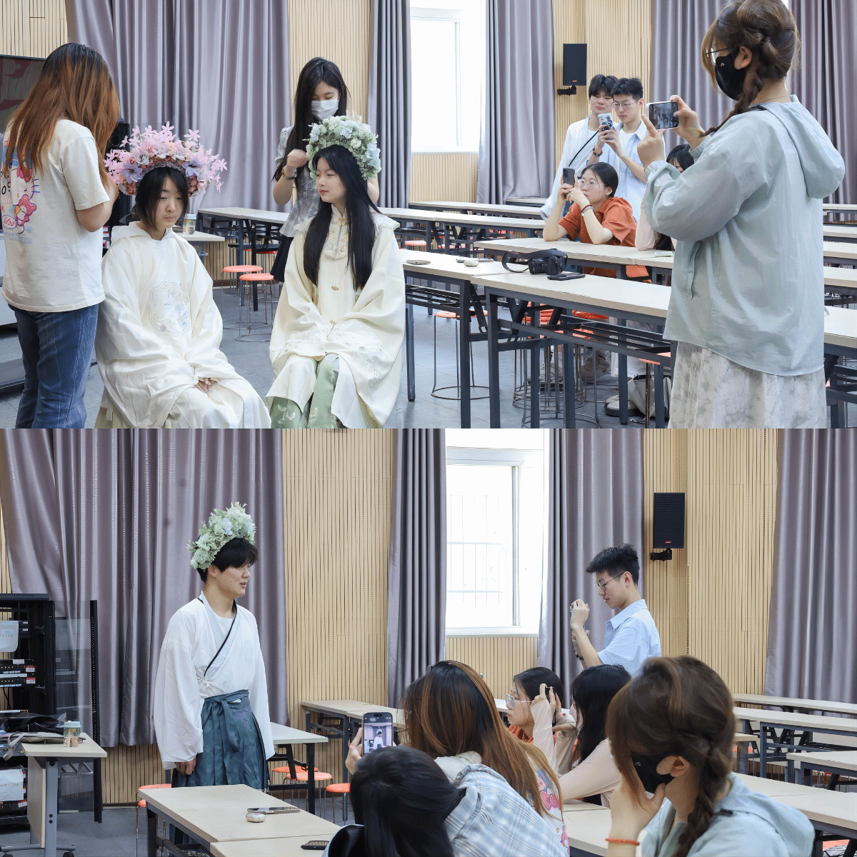 拍摄结束后,摄影俱乐部的成员也纷纷加入体验簪花文化的行列中。他们放下拍摄工具,穿上提前准备好的汉服,为彼此挑选并佩戴簪花头饰,在享受簪花乐趣的同时“零距离”欣赏这一传统工艺的魅力。
