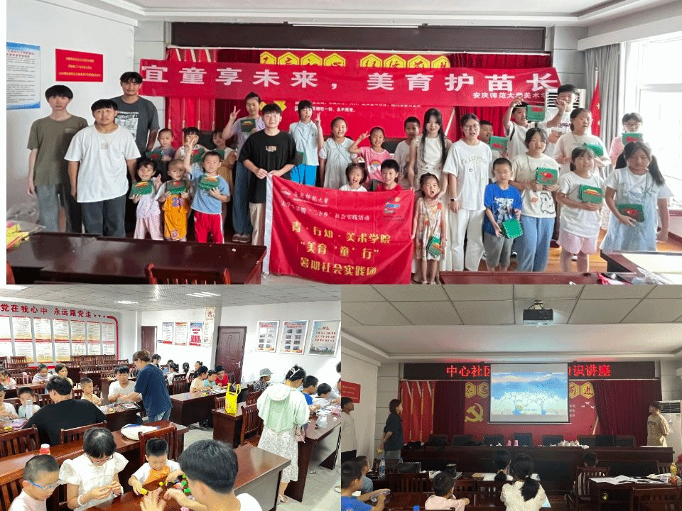 近日,sunbet青•行知“美育‘童’行”暑期社会实践团前往安庆市宜秀区大龙山镇中心社区开展了暑期“三下乡”社会实践活动,团队成员立足学科专业特色,将红色文化与艺术相结合,开设系列暑期艺术课堂,带领社区近30余名儿童感悟艺术魅力,传承红色基因和优秀传统文化。