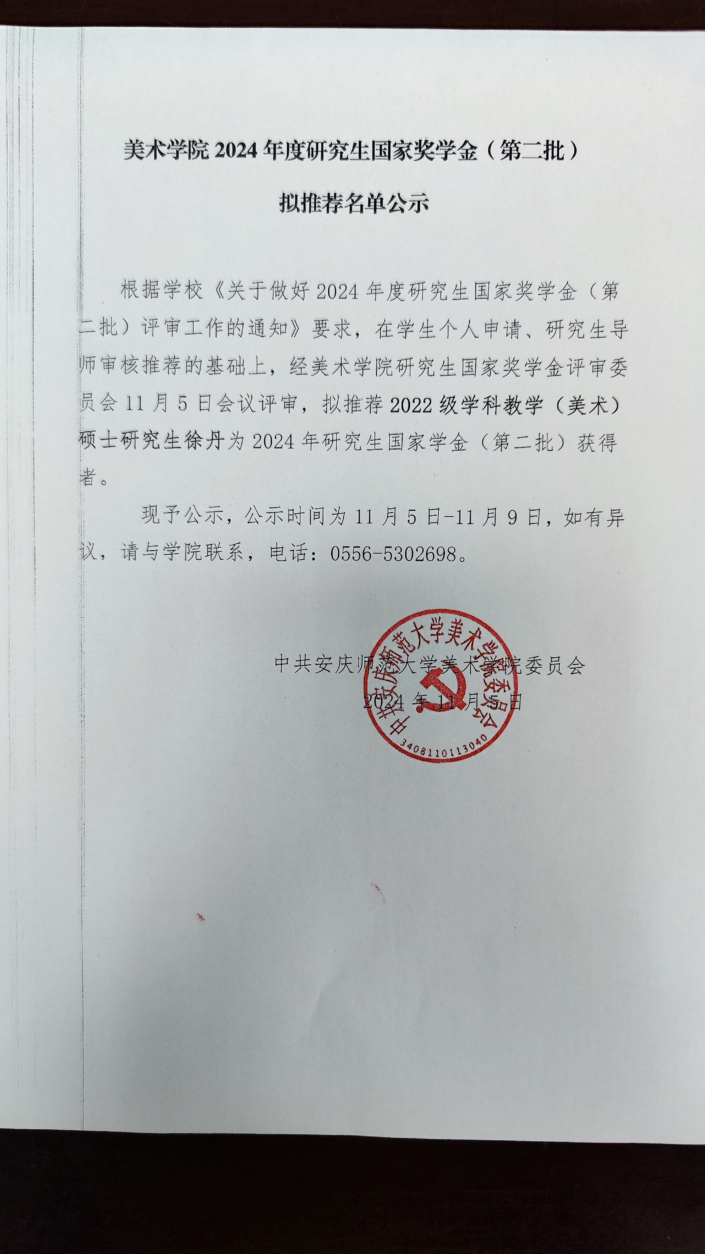 根据公司《关于做好2024年度研究生国家奖学金(第二批)评审工作的通知》要求,在员工个人申请、研究生导师审核推荐的基础上,经sunbet研究生国家奖学金评审委员会11月5日会议评审,拟推荐2022级学科教学(美术)硕士研究生徐丹为2024年研究生国家学金(第二批)获得者。