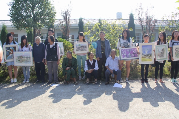 在五横乡敬老院,志愿者们有的为老人整理房间和打扫卫生,有的陪老人聊天。一些老人说话已经不那么利索,耳朵也不太好使,与志愿者们的聊天排解了他们内心的寂寥。为了让老人们感受到更多关爱,有些同学还主动为他们按摩起来,像是对待自己家中的长辈一般,让他们感动不已。志愿者们还帮助敬老院的工作人员一起打理菜园,浇水,除草……活动中,志愿者们精心准备了歌唱、舞蹈与戏曲等文艺节目,老人们欣赏得津津有味。活动的最后,志愿者们将该院经济困难生捐赠的10幅优秀作品捐献给了敬老院。