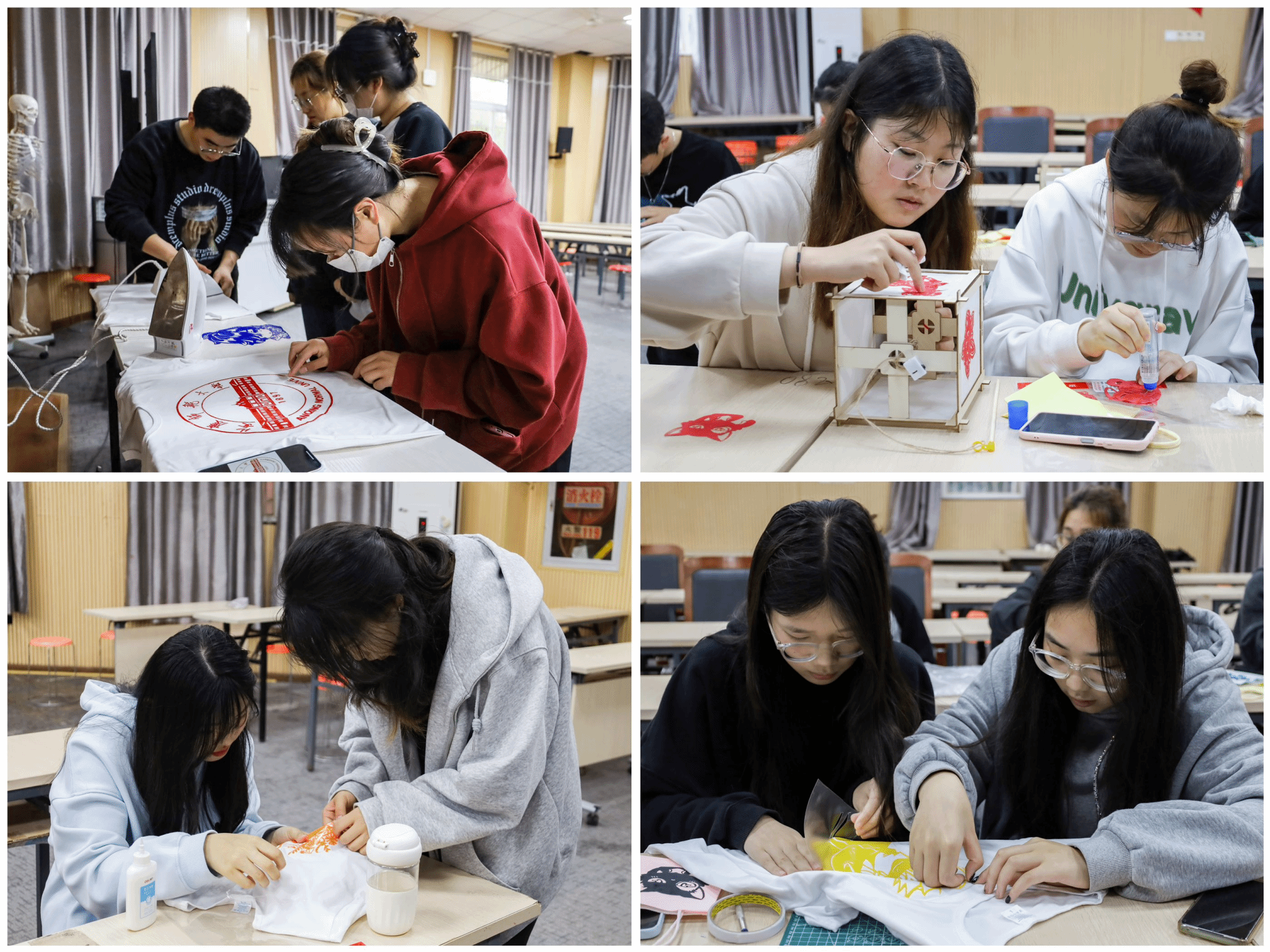 将校徽剪纸转印到T恤上是此次实践中的重头戏。校徽剪纸图案细致,较难刻印,这幅热转印剪纸由俱乐部成员花费两天合作完成。红楼剪影、圆环细线,公司的中英文名称……转印前,陶悦和三位成员将校徽图案进行拼接。由于组成校徽的小型图案在过程中容易被熨斗烫化,所以需格外注意熨烫的力度。在半个多小时的忙碌中,印有校徽的T恤“新鲜出炉”,成品效果远超俱乐部成员们的预期。