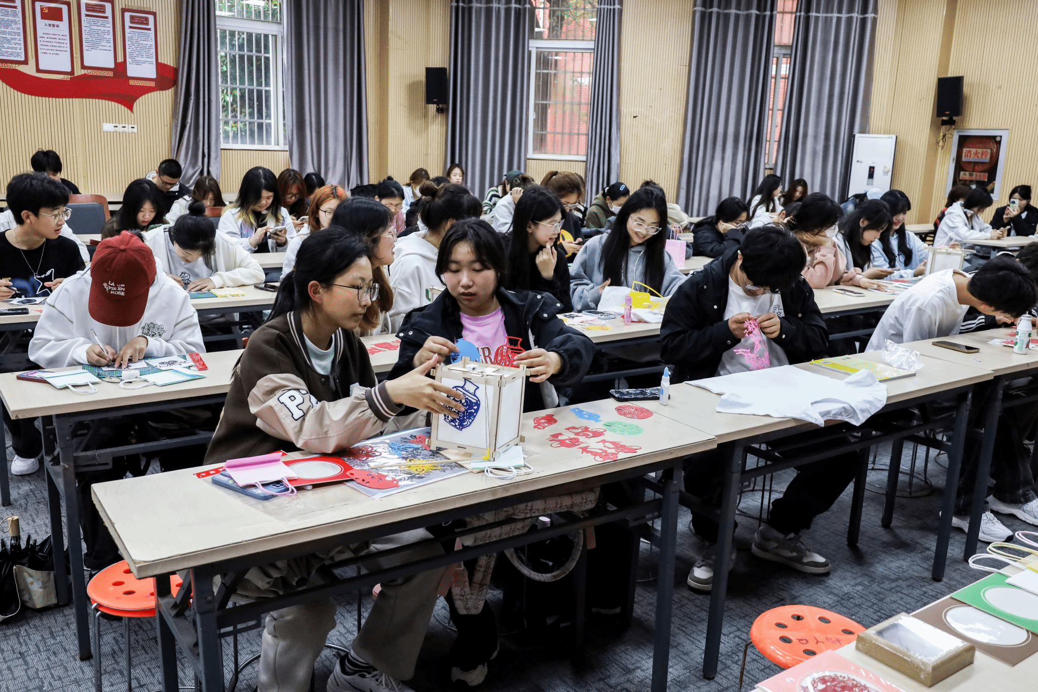 另一侧,百余名员工分组领取材料,将此前刻好的小型剪纸用胶水粘贴在宣纸灯笼与礼袋的表面。按顺序拼接木条、宣纸与流苏挂坠,将生肖与脸谱剪纸依次粘贴在宣纸上,一个传统韵味十足的宣纸灯笼便诞生于设计学类专业2023(2)班的王乐乐手中。“于我而言,每剪刻一个新的图案都像在解读一个新故事,将剪纸粘贴在灯笼上更是赋予了它新的生命。”平日里就热爱剪纸的王乐乐不禁感叹此次实践的创意。