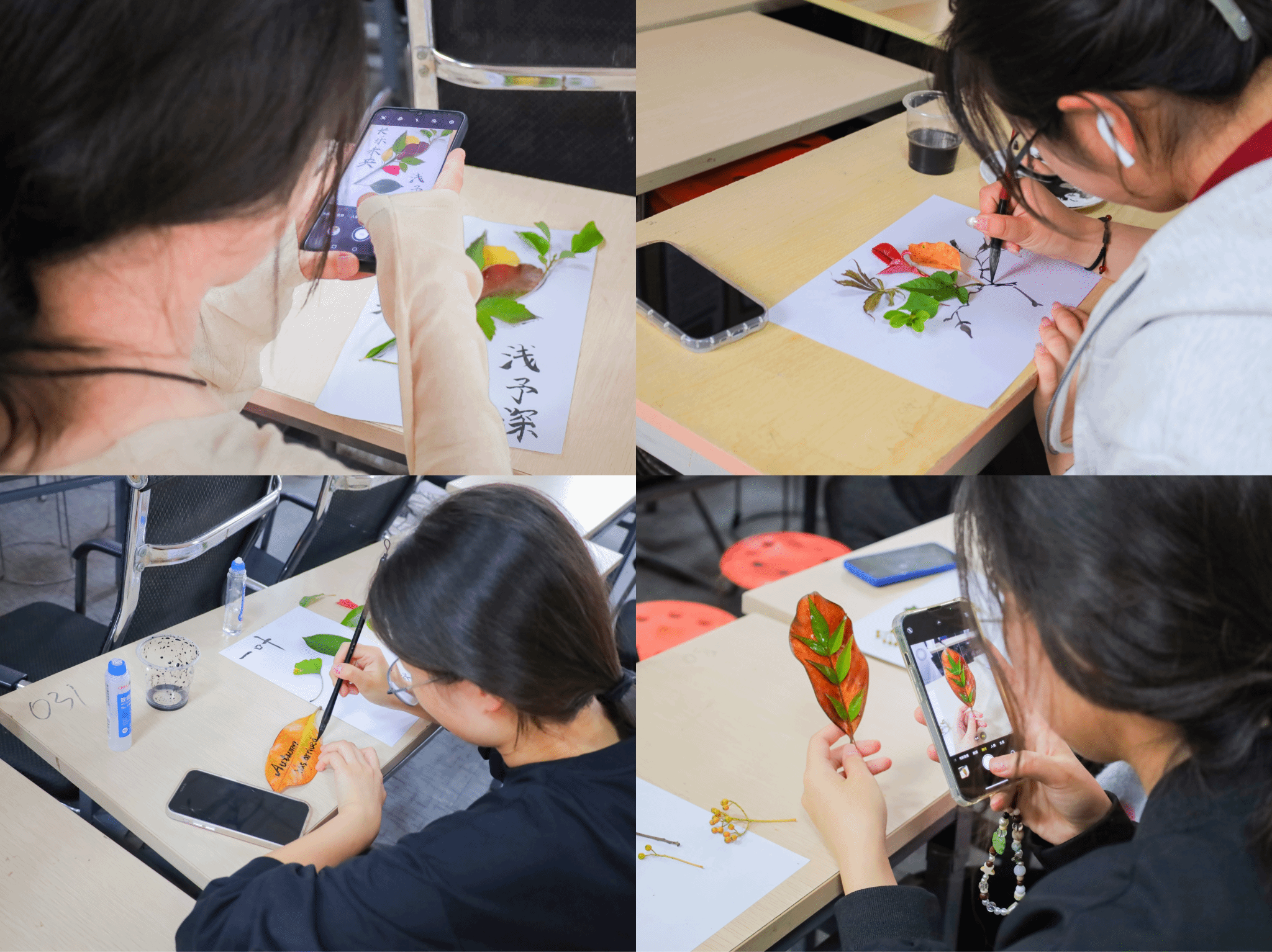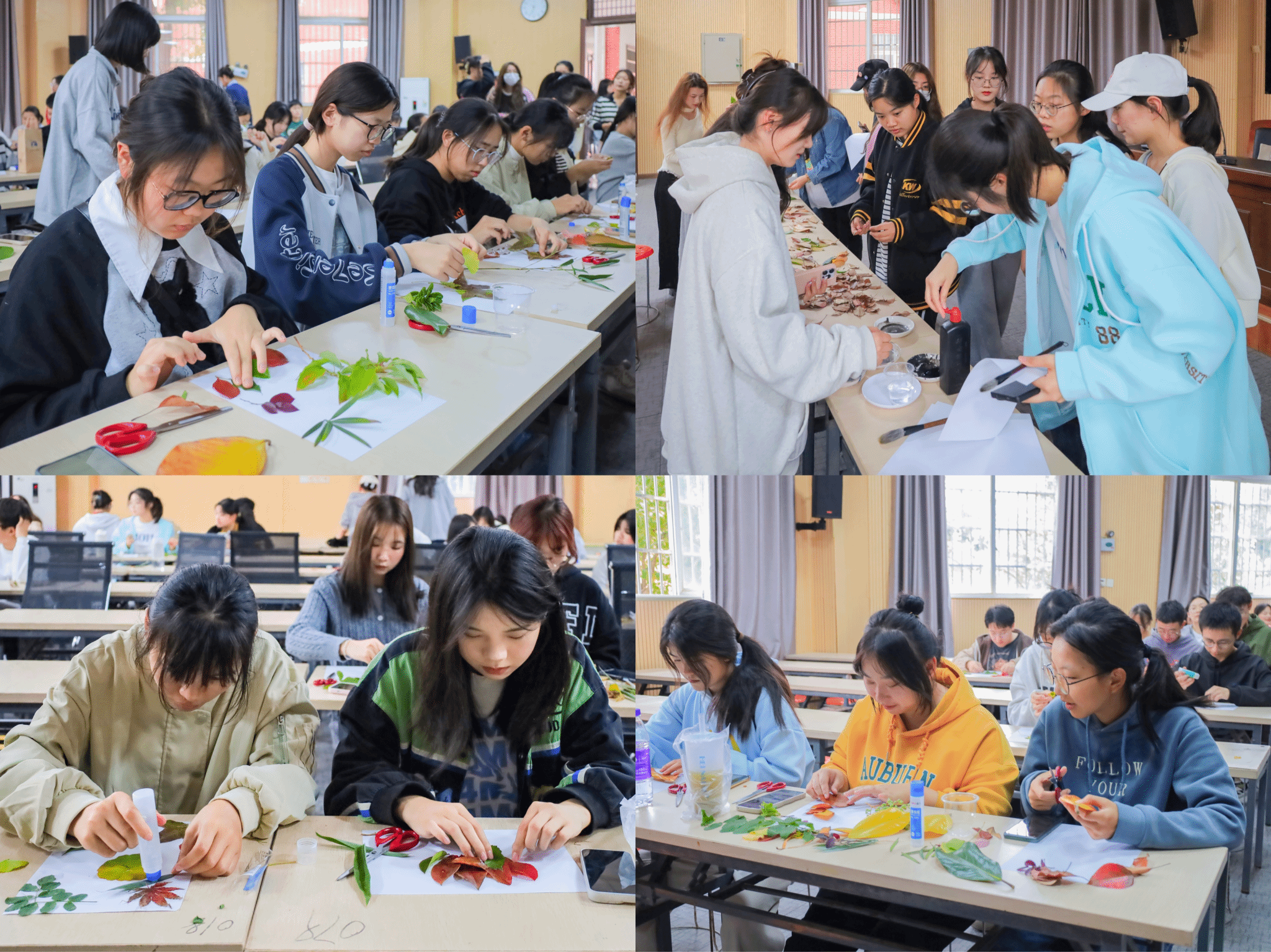 “平时经常看到道路上的落叶在清扫后被运进垃圾桶,但某一天我‘灵光一闪’,想到落叶可以作为一种环保的创作材料。”活动负责人,视觉传达设计专业2022(2)班的许艳介绍,活动开始前三天,她与工作人员绕校园绿化道一圈,共收集15袋色彩外形各不相同的落叶,希望参与者能够大胆创作,放松身心。